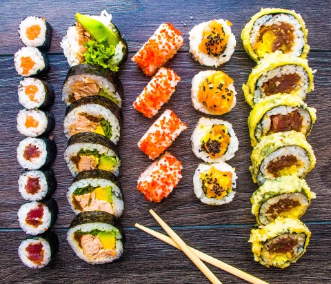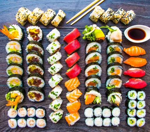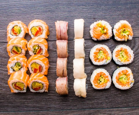 48 sztuk, dla 2 osób, 6 różnych smaków sushi w wygodnej formie hosomaków (łosoś, tuńczyk, krewetka parzona, maślana, surimi, japońskie pikle), pełen skład: 8xHOSO SAKE, 8xHOSO MAGURO, 8xHOSO IBODAI, 8xHOSO EBI, 8xHOSO KANIKAMA, 8xHOSO KANPYO OSHINKO OGÓREK, wasabi, imbir, 2x sosy sojowe, 2x pałeczki