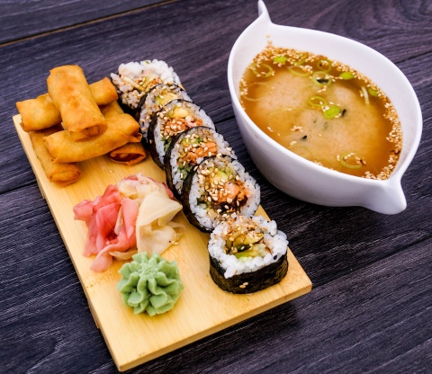 12 sztuk (6 szt. sushi, 5 spring roll, 1 zupa miso), pieczony łosoś w sosie teriyaki, podany z chrupiącymi spring rollsami i uzupełniającą je zupą miso, pełen skład: 6xFUTO SAKE GRIL, 5x SPRING ROLLS WARZYWNE, 1xMISO TOFU, imbir, wasabi, 1x pałeczki, 1x sos sojowy.