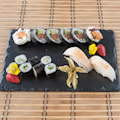 6 szt. Futomak łosoś, awokado, philadelphia. 6 szt. Futomak tuńczyk, ogórek, majonez. 6 szt. Futomak maślana w tempurze, rzepa, pikantny majonez. 8 szt. Uramak krewetka w tempurze, łosoś. 8 szt. Uramak paluszek krabowy, awokado, tobiko, panko. 6 szt. Hosomak łosoś. 6 szt. Hosomak tuńczyk. 4 szt. Nigiri łosoś.4 szt. Nigiri tuńczyk. 4 szt. Nigiri maślana. 4 szt. Nigiri krewetka. 4 szt. Gunkan kawior