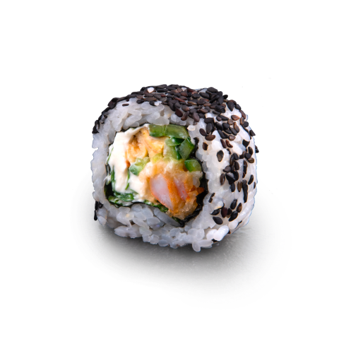krewetka królewska w cieście, naleśnik tamago, serek Philadelphia, rukola, ogórek, obtoczone w czarnym sezamie