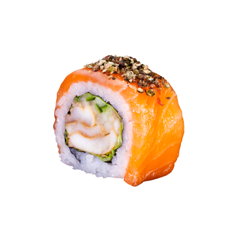 grillowany łosoś teriyaki, serek Philadelphia, wasabi, ogórek, kampyo, tobico