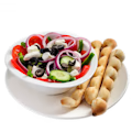 sałatka grecka z pomidorami, cebulą, zieloną papryką, świeżym ogórkiem, czarnymi oliwkami, serem feta, polecany dressing: oliwa z oliwek